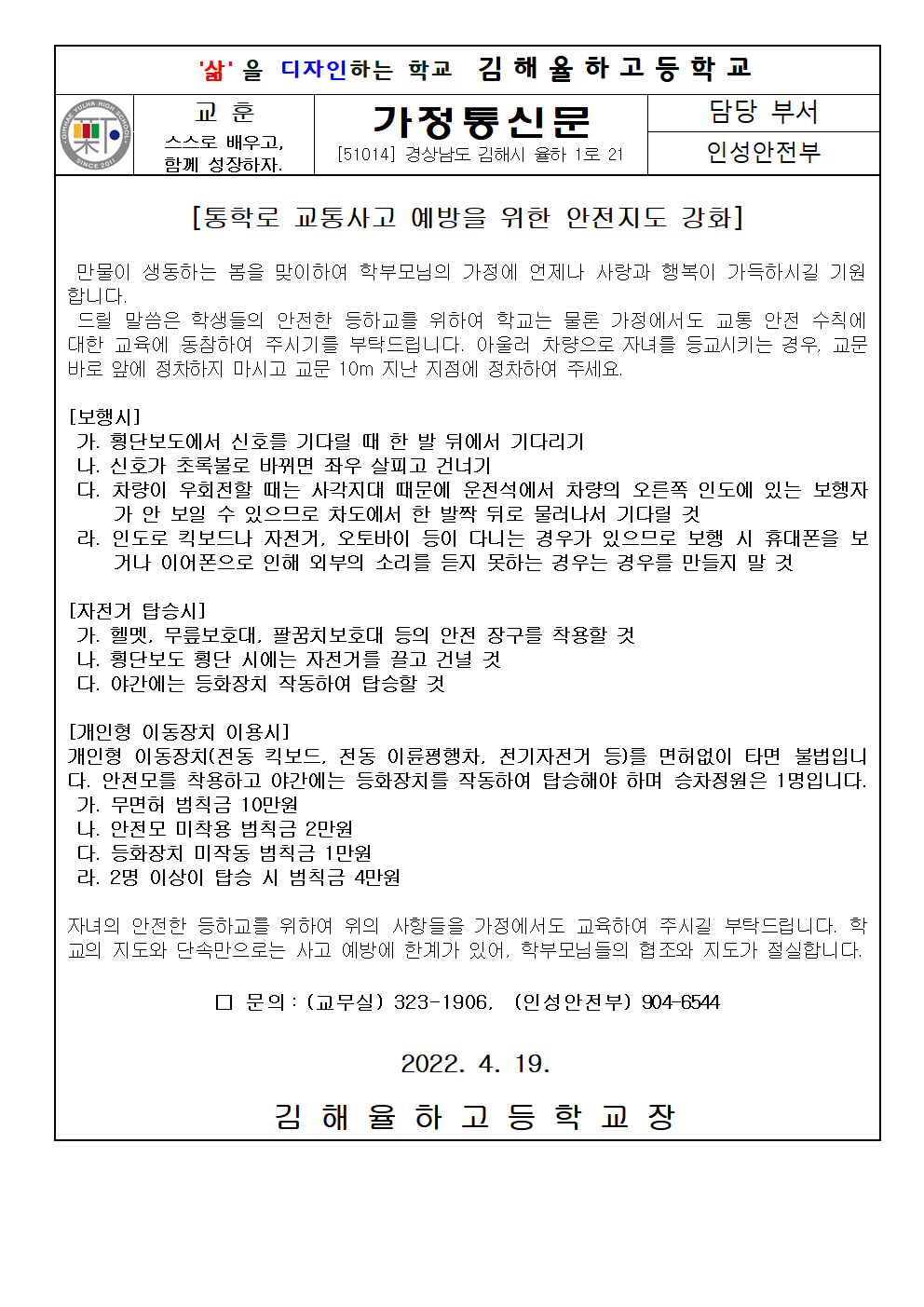 통학로 교통사고 예방을 위한 안전지도 강화 가정통신문