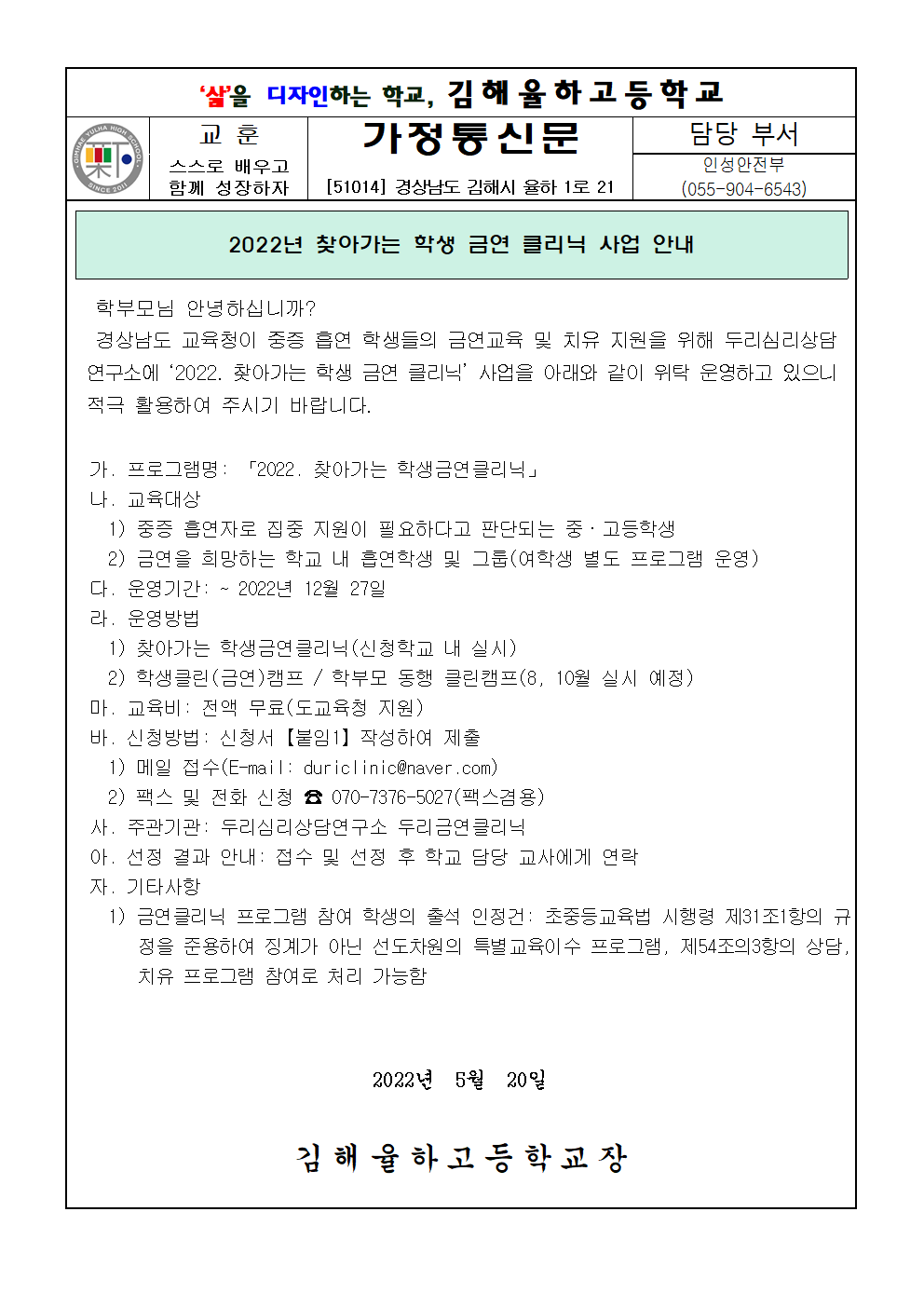 2022. 찾아가는 학생금연클리닉 사업 안내 가정통신문.hwp