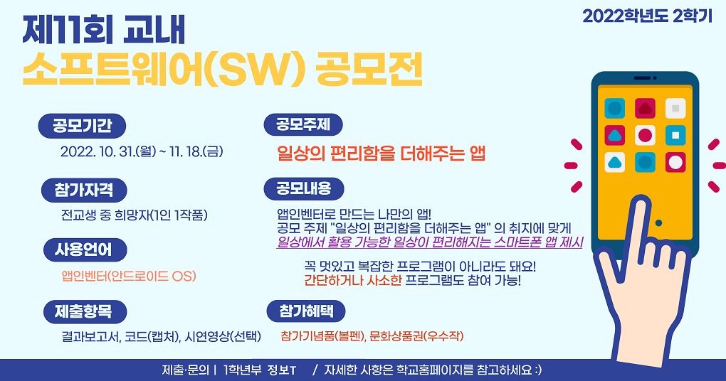 1. 공모 주제 : 일상의 편리함을 더해주는 앱 2. 공모 기간 : 2022. 10. 31.(월) ~ 11. 25.(금) (공모 기간 내 제출된 작품만 인정함) 3. 공모 대상 : 재학생 중 누구나 4. 사용 언어 : 앱인벤터(필요시 프로그램 활용법 교육 가능, 문의 : 정보T) 5. 제출 항목 1) 첨부 파일의 결과보고서 - 1학년부 정보T에게 직접 제출 2) 프로그램 코드 캡처본 - hongmh7@naver.com 제출 3) (선택) 시연영상 - hongmh7@naver.com 제출 6. 우수작 발표 : 2022. 11. 30.(수)