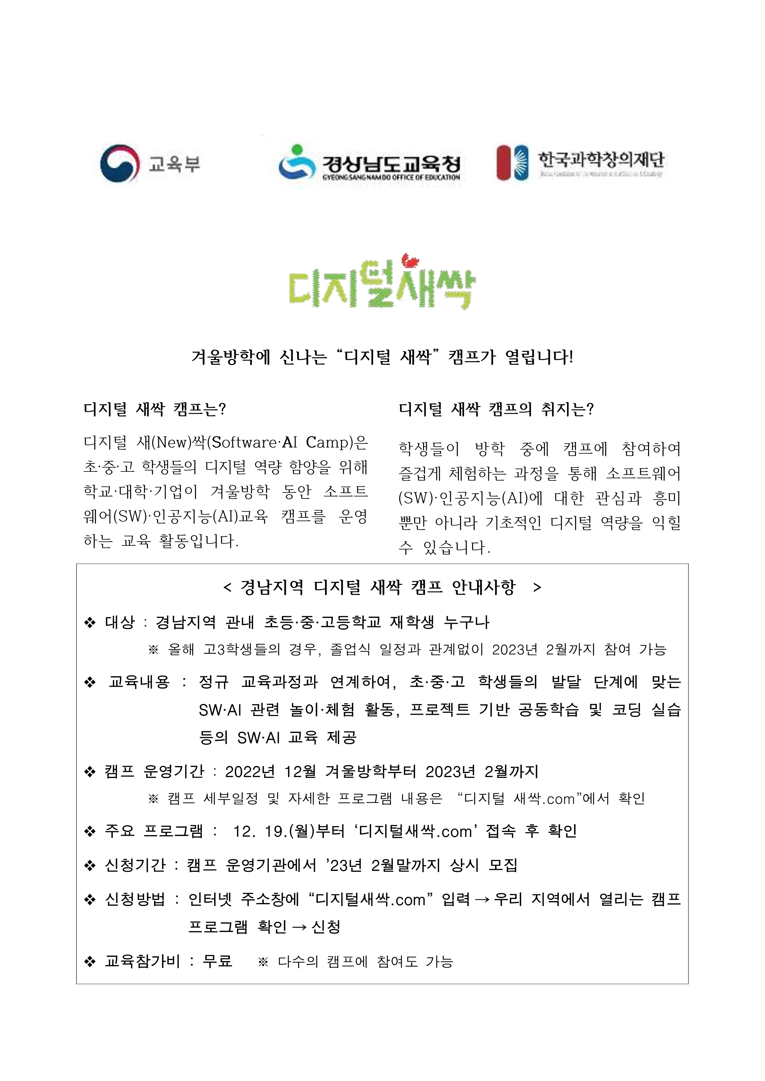 디지털 새(new)싹(Software AI Camp) 교육 캠프 사업 안내