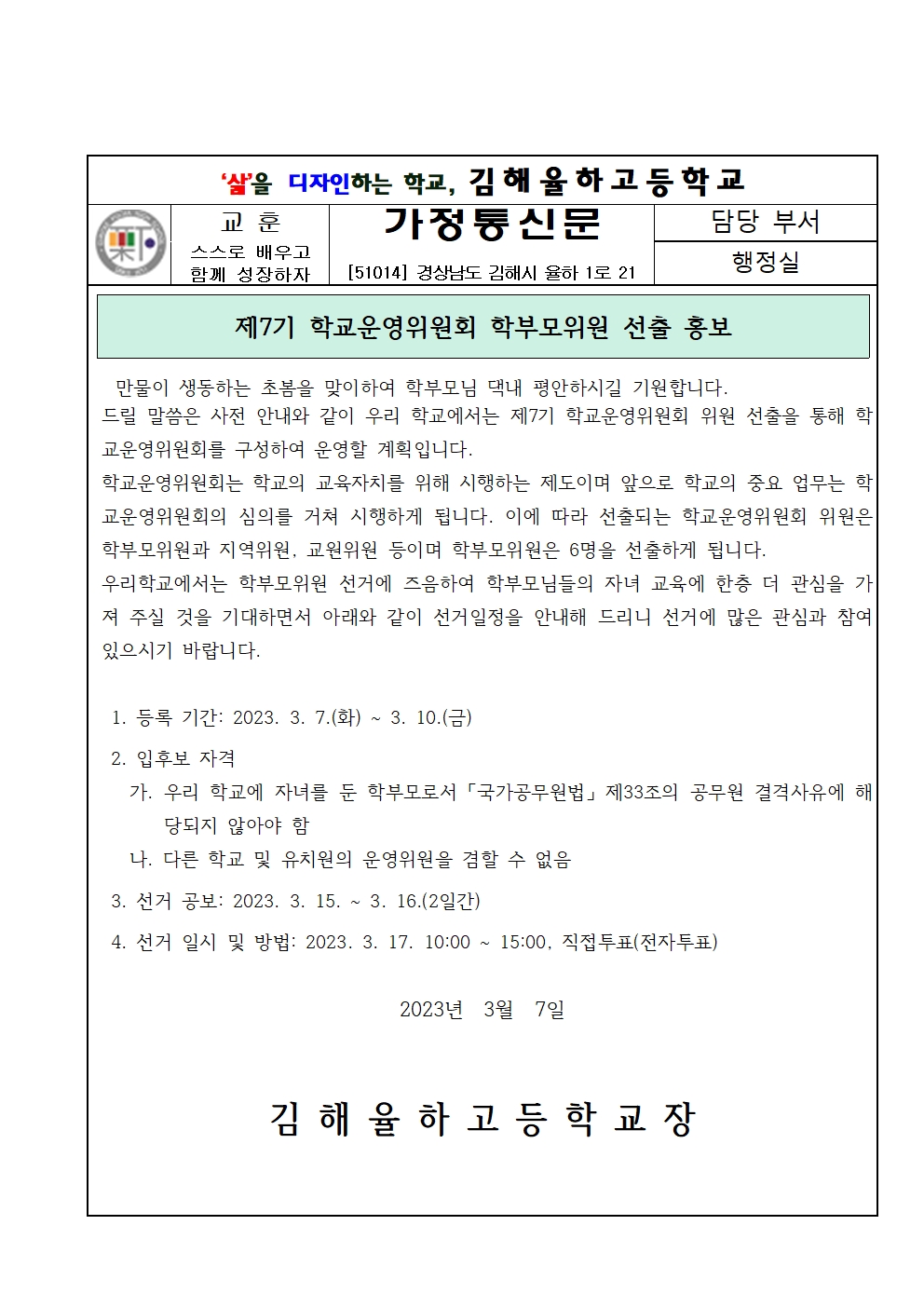 제7기 학교운영위원회 학부모위원 선출 홍보