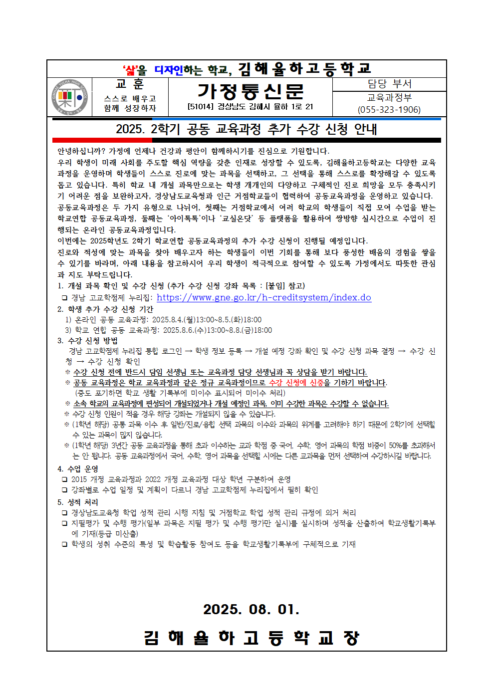 2025학년도 2학기 공동 교육과정 추가 수강신청에 대한 가정통신문입니다.